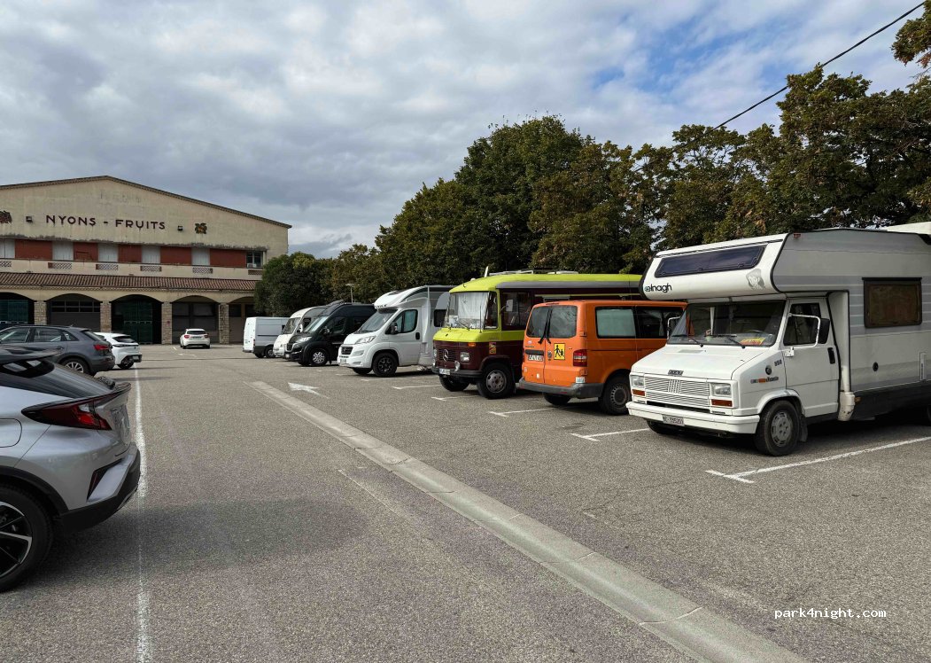 Stationnement sur le parking de la coopérative de Nyons - fruits ; calme, sympa (pizzaiolo) - vidange des eaux grises.
