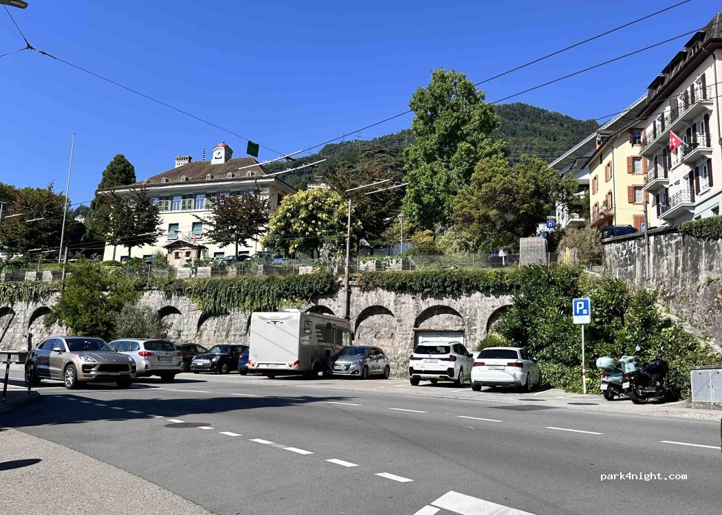 Nice parking place to go for a swim at the Leman. Free parking for max 3h. We fit easily our 7m MH