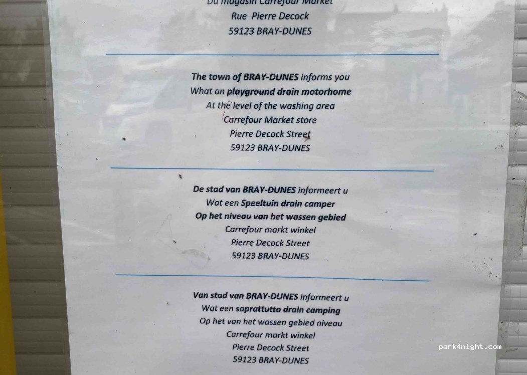 Kostenlose Parkplätze stehen neben dem Fremdenverkehrsamt Bray-Dunes zur Verfügung. Die Stadtpolizei erlaubt das Parken von Wohnmobilen, solange sie die markierten Parkplätze nicht überschreiten.