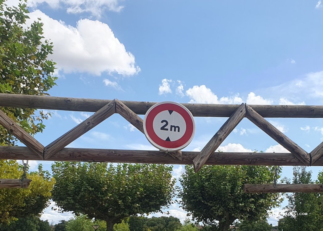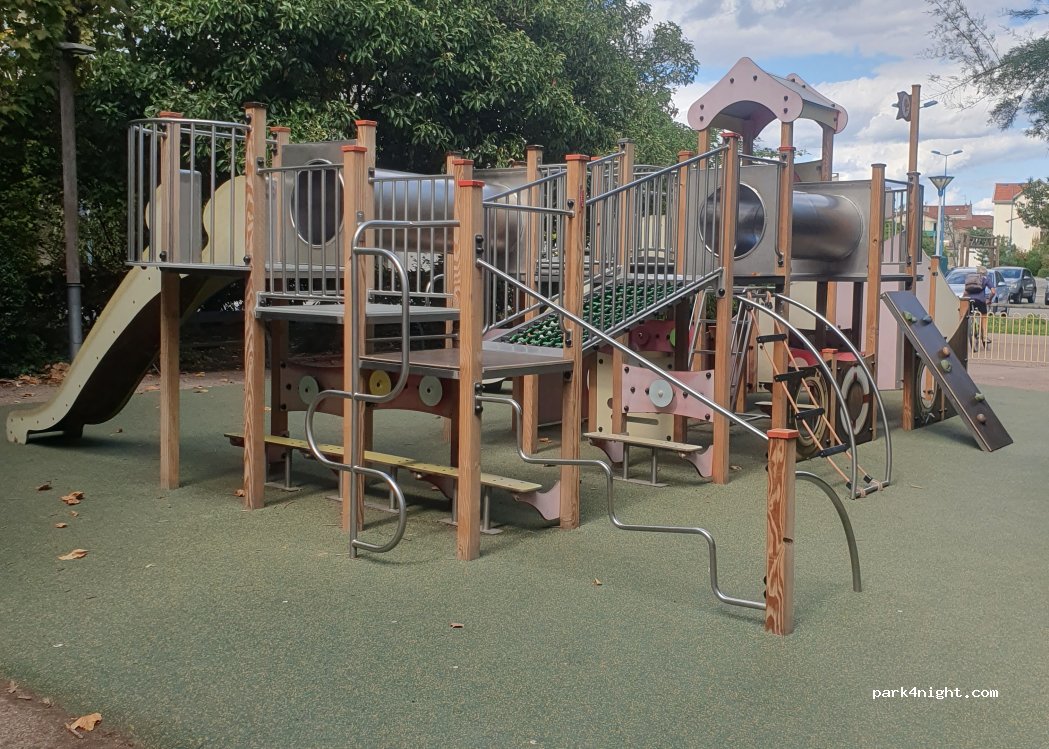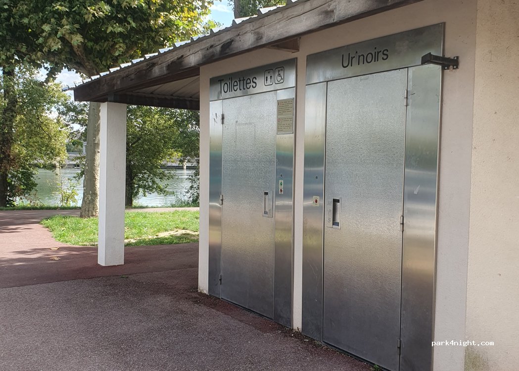 Parking with about 50 spaces, tree-lined but limited shade. Height limited to 2m. Shaded playground, spotless, with a water point inside. Restrooms nearby. Area for bowlers. Large spaces for walking, jogging and cycling (track). City parking, therefore suitable only for vans. We spent a quiet night there.