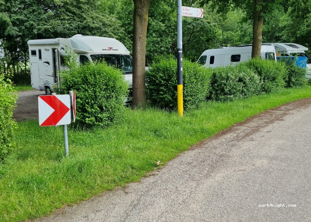 Petit parking gratuit à l'entrée du village. Le stationnement est à partager avec les voitures. L'endroit est stabilisé, ombragé, calme et agréablement entouré de prairies. Dans le village organisé comme une forteresse et ses remparts vous trouverez une église et un seul commerce (Fermé et à vendre !). Belles promenades aux alentours, principalement vers le Rhin (Frontière Germano/Néerlandaise).