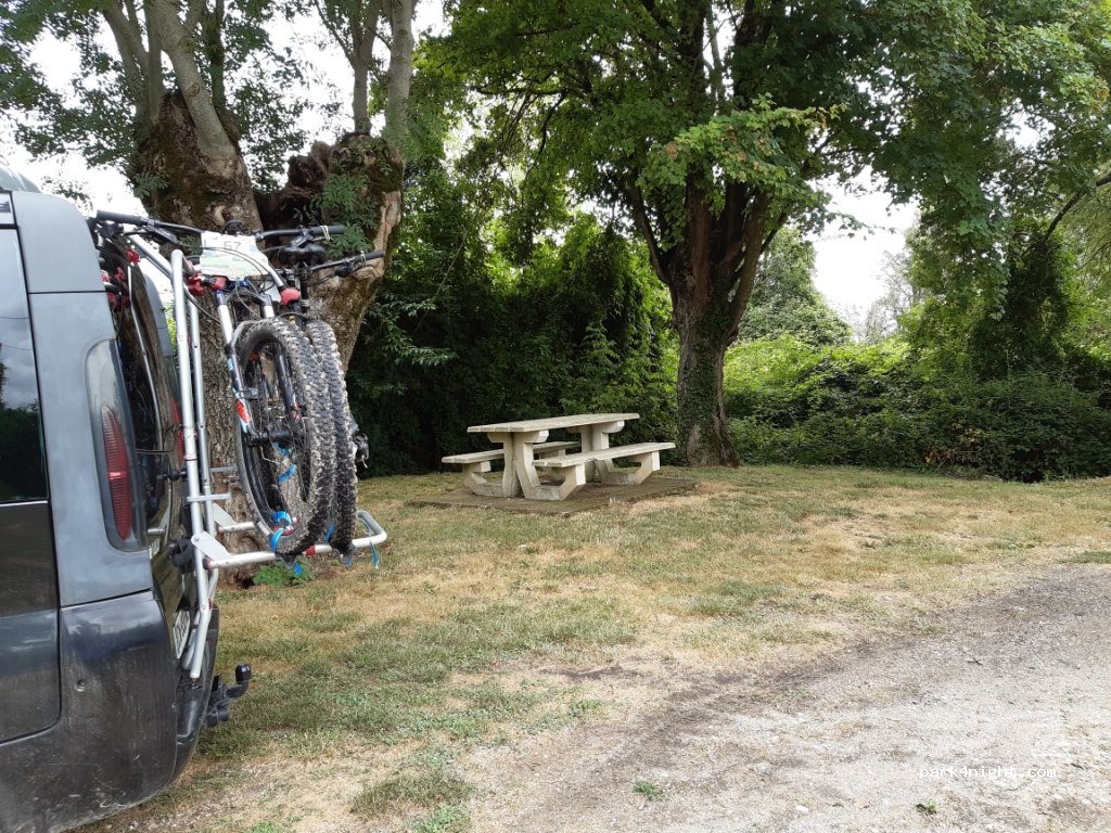 Jolie petite aire de piquenique. Des plots en béton ont été installés à l’entrée ce qui oblige à se mettre en bord de route.