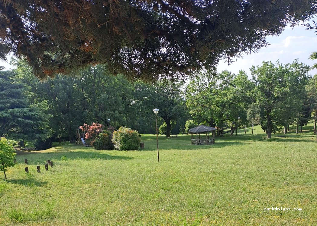 piccolo parcheggio con carico, scarico acque nere e grigie. Possibilità di utilizzo di corrente (a gettoni). Adiacente ad un bellissimo parco con zona barbecue. A 5 min a piedi ci sono Conad, forno, pasticceria, bar e diversi ristoranti. Unica pecca è la strada molto vicina.