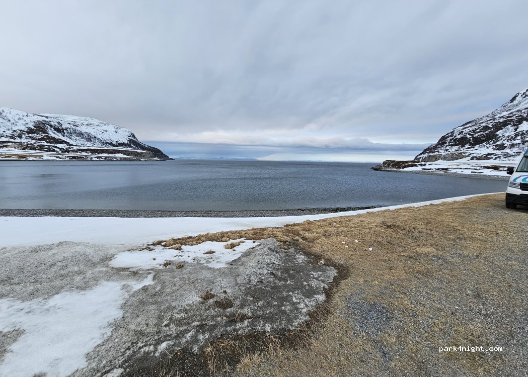 Dernier parking où la plage de galets et directement accessible. Plus loin sur l’unique route qui accède au cap nord,il y a des aires dont les falaises et ravins surplombent la mer . Aire en bord de route avec passages de voitures et bus à certaines heures , entre deux endroit calme et paisible .