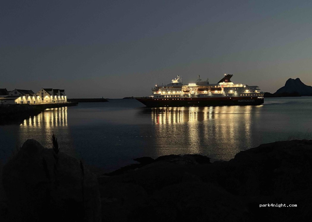 Top Stellplatz um die Hurtigrutenschiffe zu beobachten, die quasi vor der Nase anlegen. 19:15 kam die Kong Harald und 22:15 die MS Polarlys. Genial. Standen hier alleine während sich entlang der E10 die Leute und die Parkplätze klopfen. Zum angeln am besten im Hafen auf die kleine Insel gehen. Da gab's reichlich Fisch