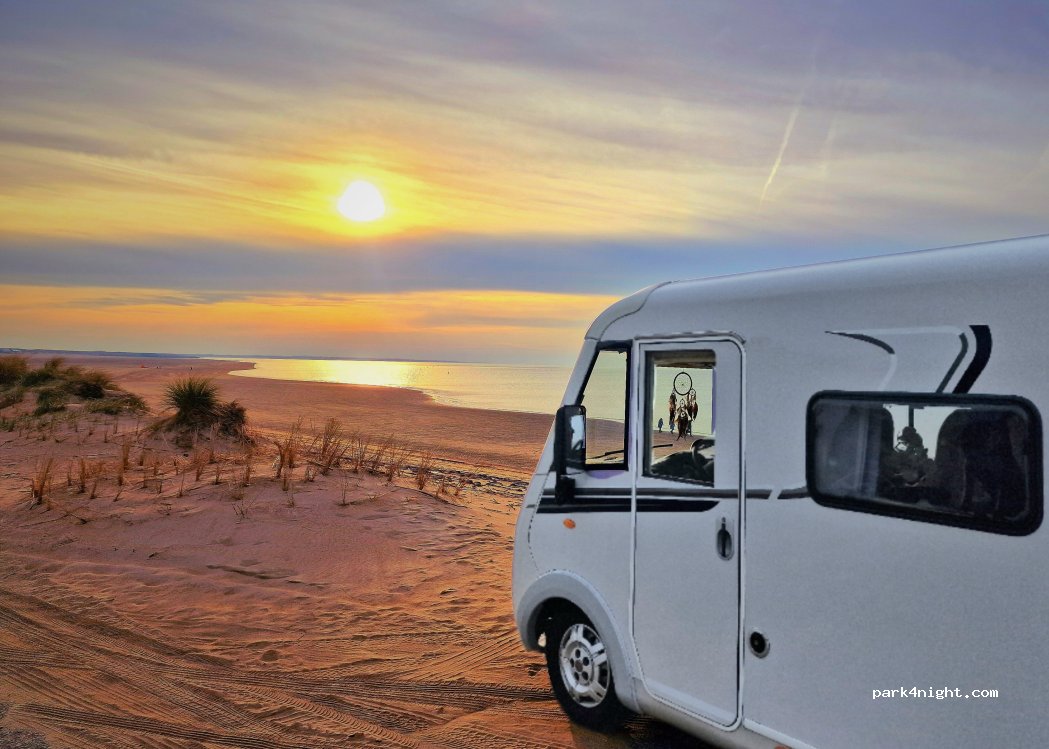 North Sea beach, in principle you can only park during the day. But there are a lot of campers. Some concerning the rules are somewhere else and come back between 5 and 7 in the morning. You are on the beach if you are there early in the morning. A lot of kytesurfers. Nice beach spot, friendly people!