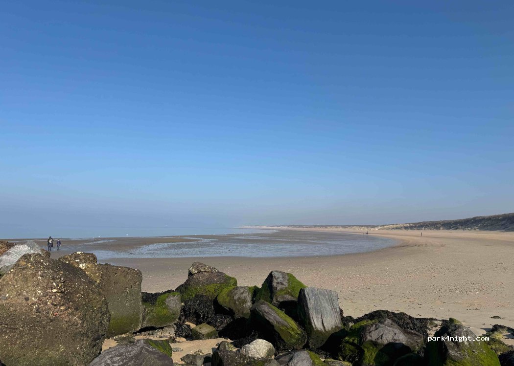 Plage de la mer du Nord, en principe, vous ne pouvez vous garer que pendant la journée. Mais il y a beaucoup de campeurs. Certains concernant les règles sont ailleurs et reviennent entre 5 et 7 heures du matin. Vous êtes sur la plage si vous êtes là tôt le matin. Beaucoup de kytesurfers. Belle plage, gens sympathiques!