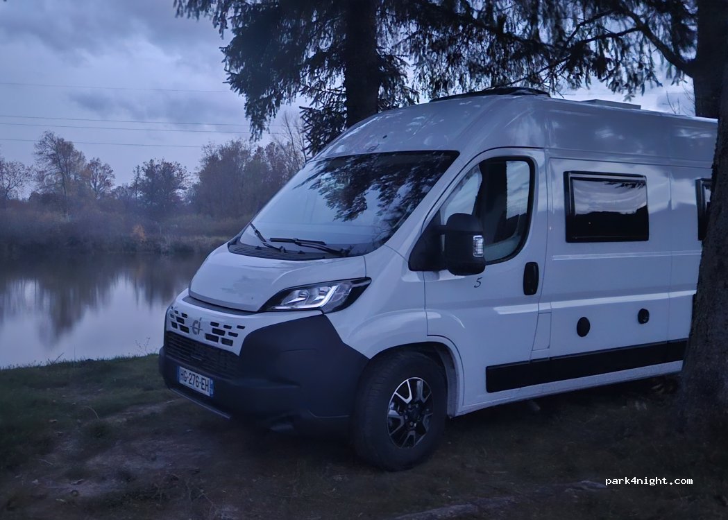 Nuit très paisible au bord de ce bel étang, superbe cadre, attention toutefois aux grands gabarits (plus de 6m),chemin carrossable en gravier, demi tour possible sur l'herbe