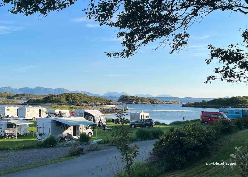 Nice campsite with a helpful owner. Lovely sea views for those fortunate to have one of the marked pitches at the front. Clean toilets and coin-operated showers. We decided to stop and extra night, as a fee others did. 330Nok per night for van & two adults. All grass site, EHU available, grey water and water fill up as you enter/ leave. Would definitely stay again.