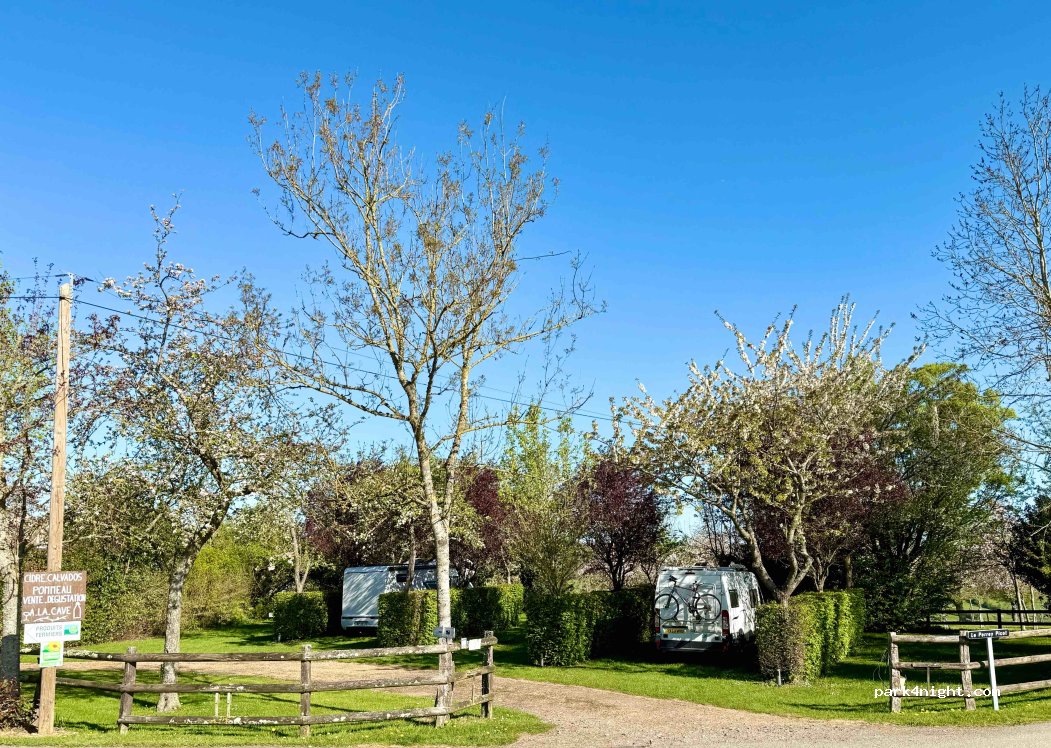 5 emplacements délimités par des haies, très tranquilles. Eau, poubelles. Les propriétaires sont très accueillants. Dégustation de leurs jus de pomme, poiré, cidre, pommeau, calvados. De belles rencontres!