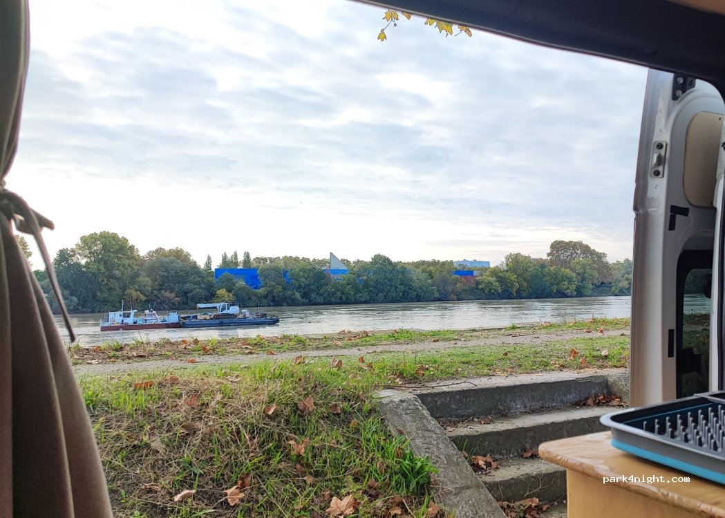 Stationnement entre les arbres face au Rhône, terrain plat. Nous avons passé une nuit tranquille, sans bruit mais l'environnement ne semble pas sécurisant. Correct pour une nuit mais pas plus.