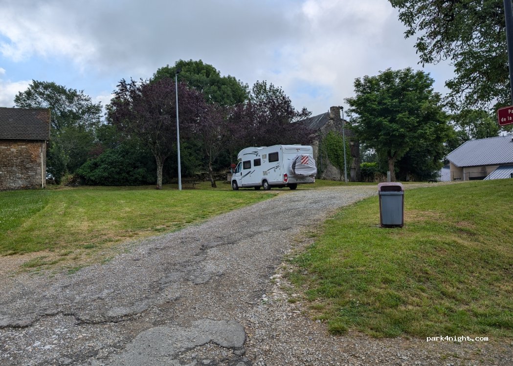 Arrivé de nuit à 20h, petite place de village en sablette derrière le gymnase à 100m de la route D911 traversant le village. Nous avons passé la nuit de samedi à dimanche, nuit très calme. Jolie vu sur la tour éclairée la nuit, les lampadaires ne sont pas allumés sur ce côté. Petit commerce en face avec possibilité d'achat de bouteille de gaz. Léger calage pour le niveau mais place relativement plane.