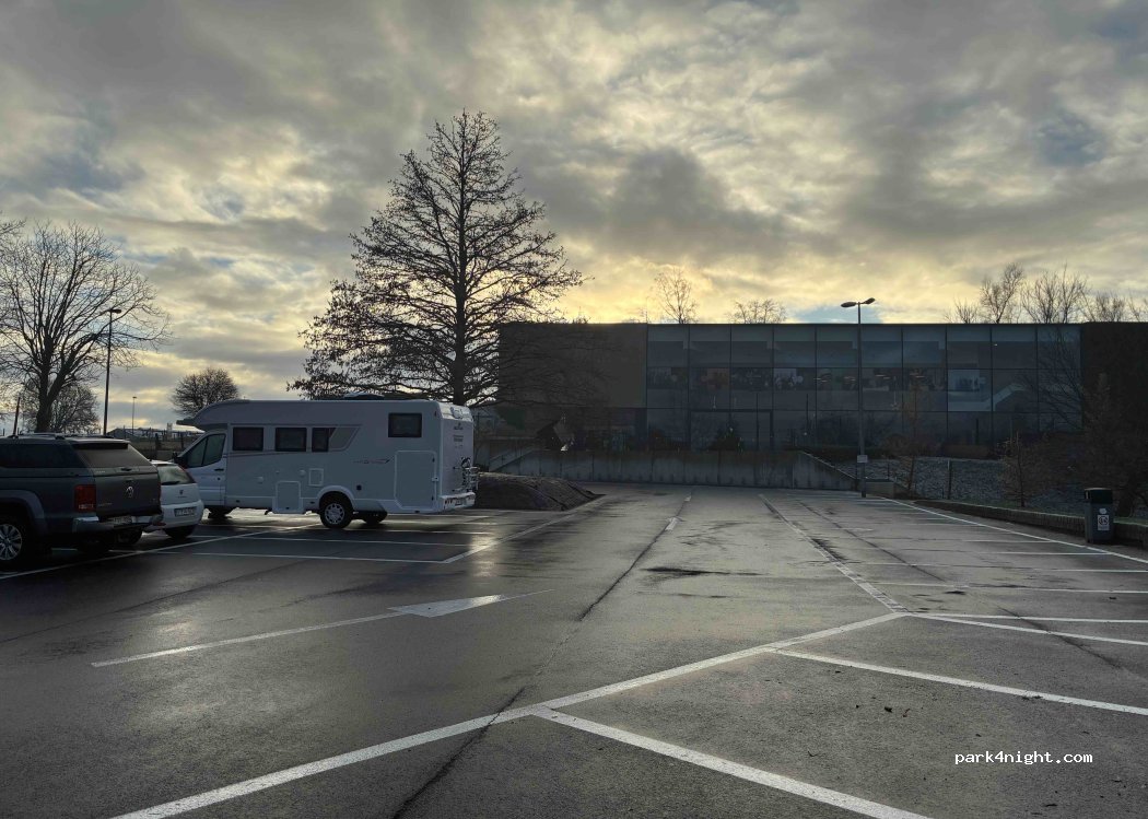 Parked for one overnight in the back area next to the soccer field. Once all activity ends it will be very calm here .Small cafetaria in the sportcenter, with local beer on tap