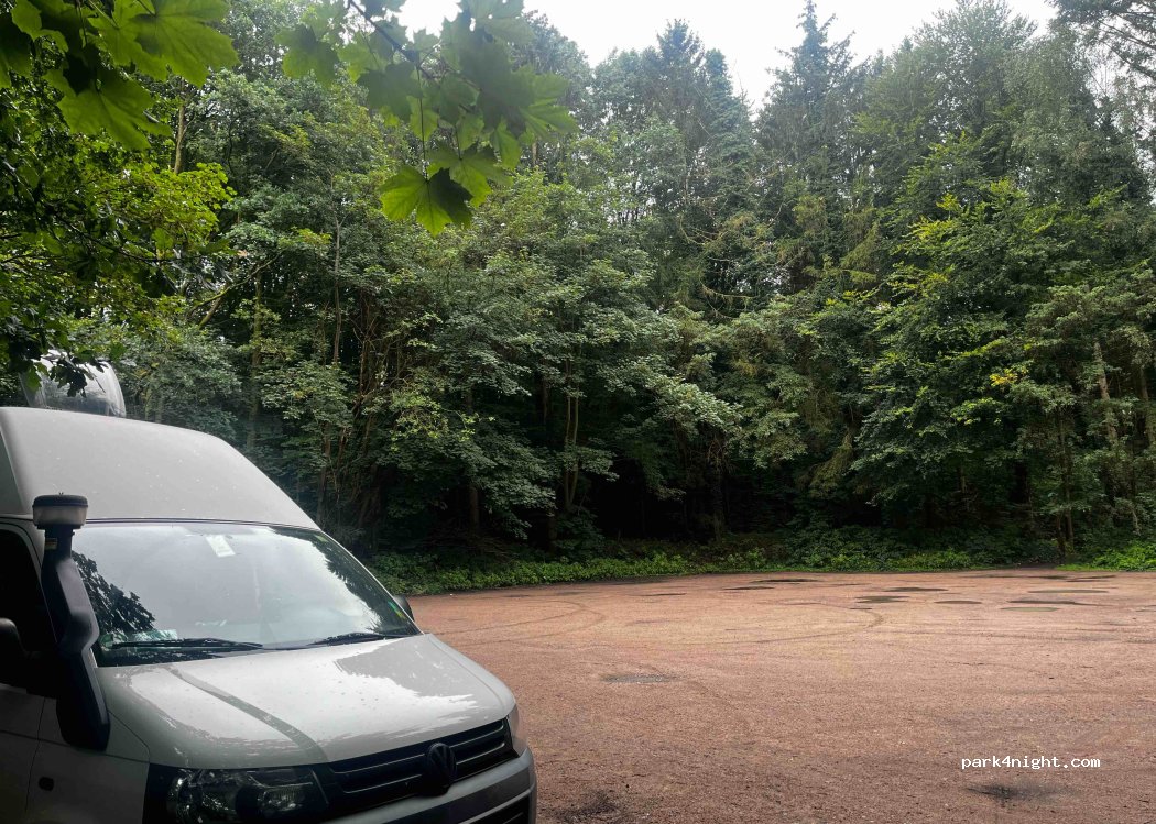 Large car park on even ground, that’s surrounded by trees. There is a busy street nearby, but you really wouldn’t notice if you wouldn’t know. There are some waste bins for general waste, paper and Glas. A swimming pool is also within 5 min walk.
