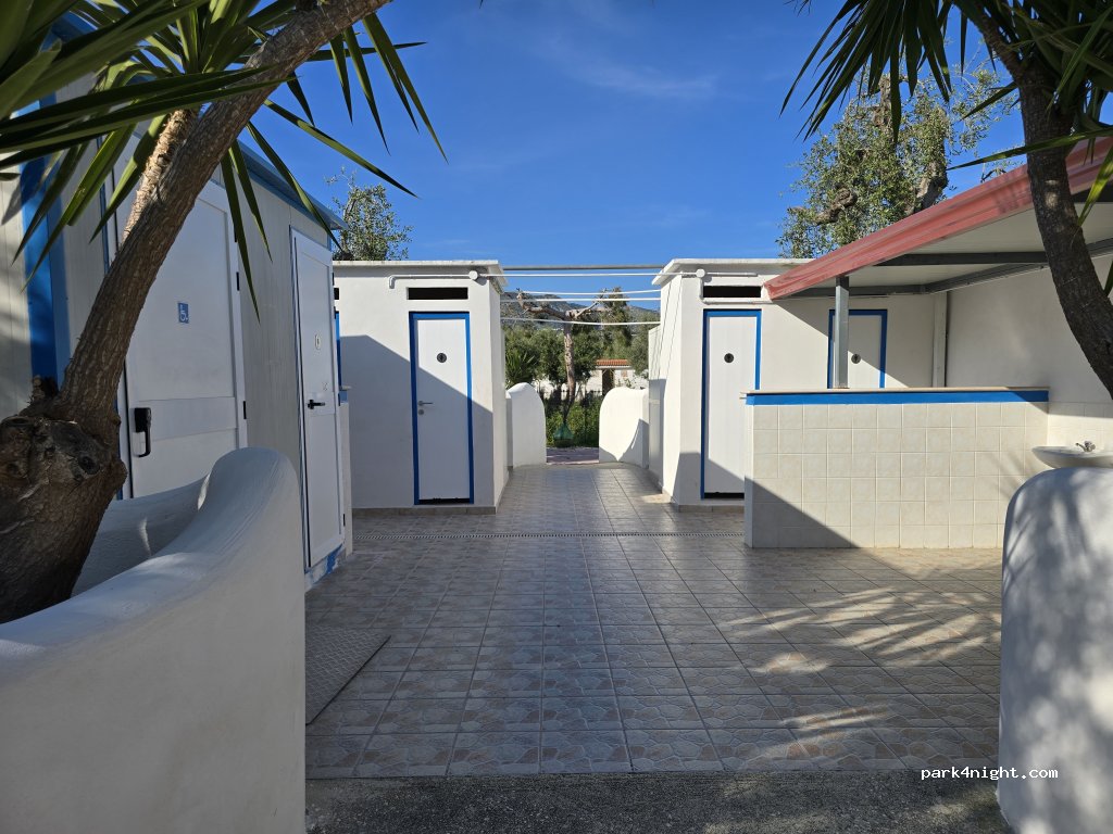 Das Gelände ist weitläufig und von üppigen Olivenbäumen beschattet. Trinkwasser und 6-Ah-Stromanschlüsse sind überall vorhanden. Die Sanitäranlagen verfügen über Münzduschen mit Warm- und Kaltwasser.