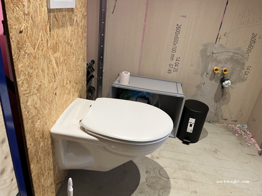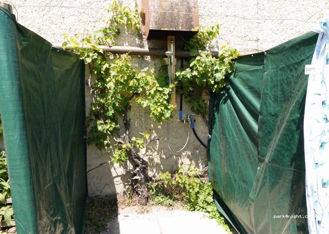 De sanitaire voorzieningen omvatten een toilet, een warmwaterfontein om af te wassen en een buitendouche met warm water.