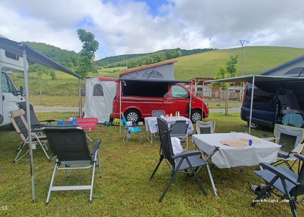 Pleasant site in a rural location. We stayed 2 nights. Only downsides being insufficient sanitary facilities for the size of the site (there are only 4 mens WCs when they are all in operation) and day to day maintenance seems to be neglected (toilet flushes and doo locks etc.). There is no shade and we were infested with flies although we couldn’t see why. Friendly staff, and a useful shop.