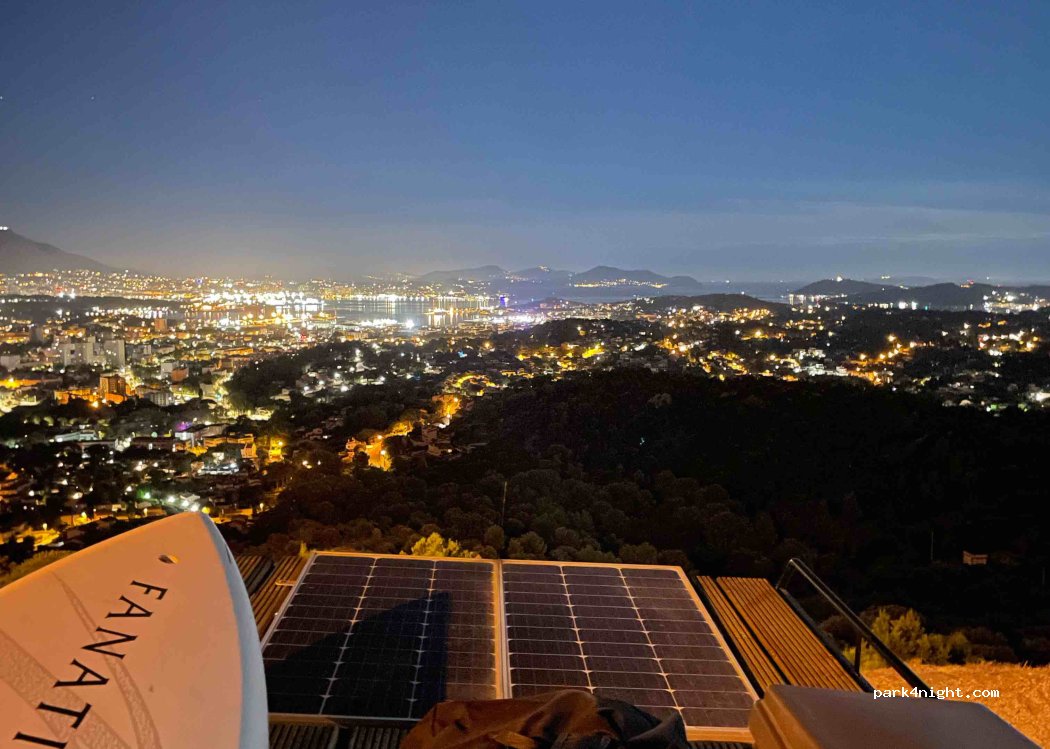 Parking Collegiate and Fort Sixfours. Fantastic view of Toulon and its harbor, La Seyne, Six-Fours and Bandol. no WC or water point. it climbs but it's tarred.