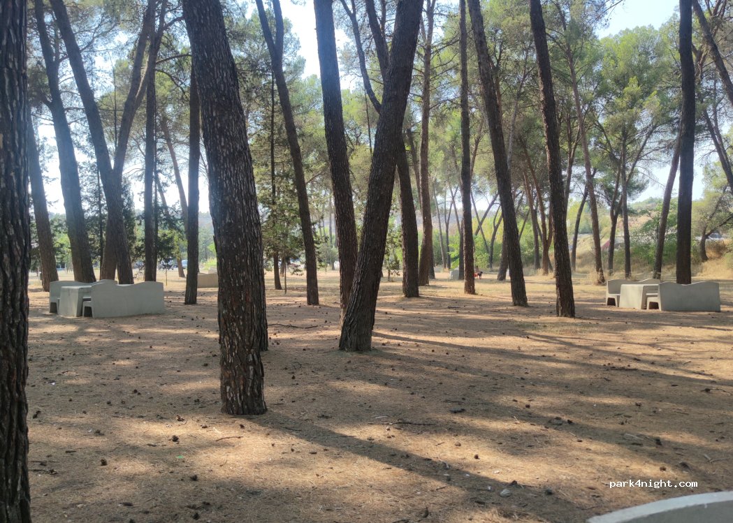 Zona de picnic con juegos infantiles. Bosque de pinos. No hemos dormido pero si descansado aunque creo que no habria problema en pasar la noche. Inconveniente: cerca via de tren justo detras de restaurante bueno y bien de precio. De los que paran camioneros