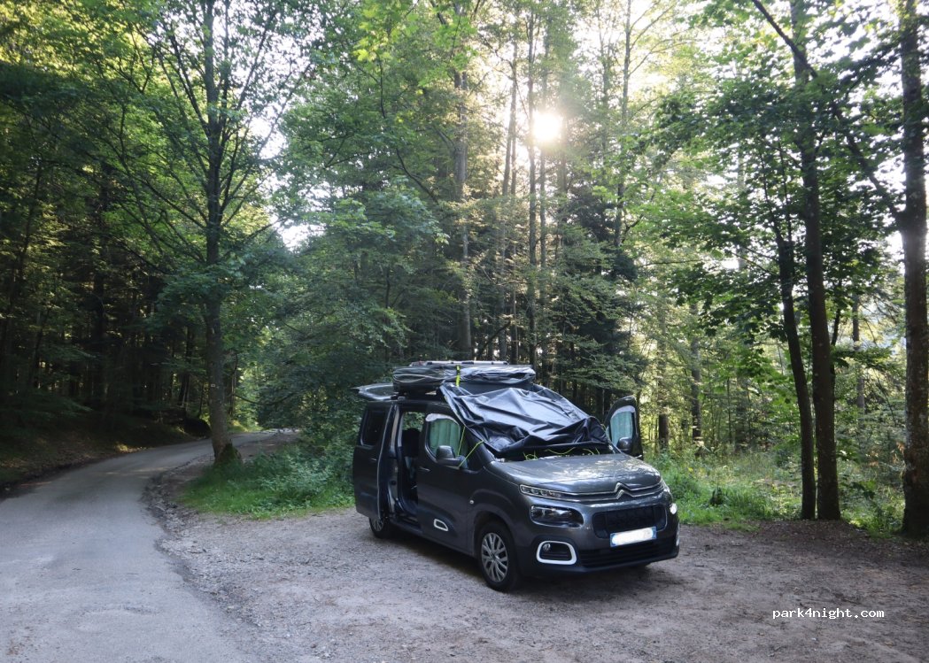 Nous avons passé une nuit calme. Le parking du bas est plat. Endroit idéal quand il fait chaud. Fromage bio en vente à la ferme du Lindenhof à proximité.