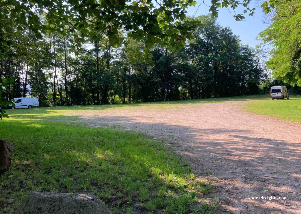 Très grand parking presque plat, entouré d’arbres. Nous y étions une nuit de samedi à dimanche et nous avons passé une très bonne nuit. Proche de la volerie par le sentier dédié