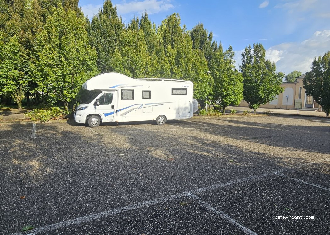 Idyllic little farm with many different animals (ponies, dogs, cats, chickens, rabbits, bees, insects of all kinds...) and a very nice host who speaks German and Englisch, has lots of good tips for the area and his mom, who likes to speak in Italian and bring apricots or blackberries. There is a mini pool to cool off in and you can rend bikes and rickshaw. The bathroom is very modern and clean. By the nearby river there is a nice beer garden with delicious foccacia. There are various small specialties to buy, such as eggs, honey, jam, wine, vinegar and olive oil. A trip to Mantua is recommended and it is half an hour from Lake Garda or Verona.You park in the field, little shade for the summer, sometimes music coming from the restaurant on the river.