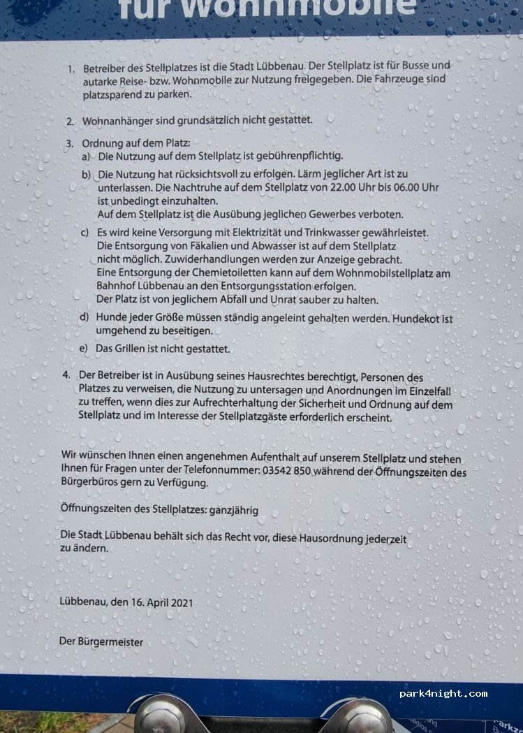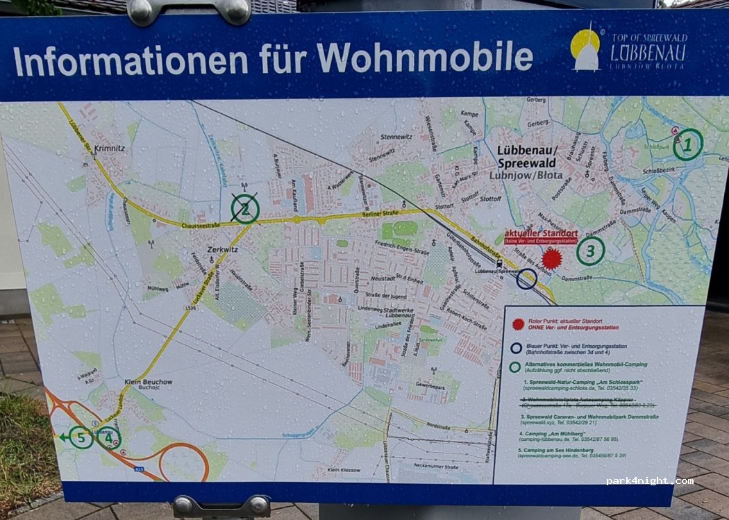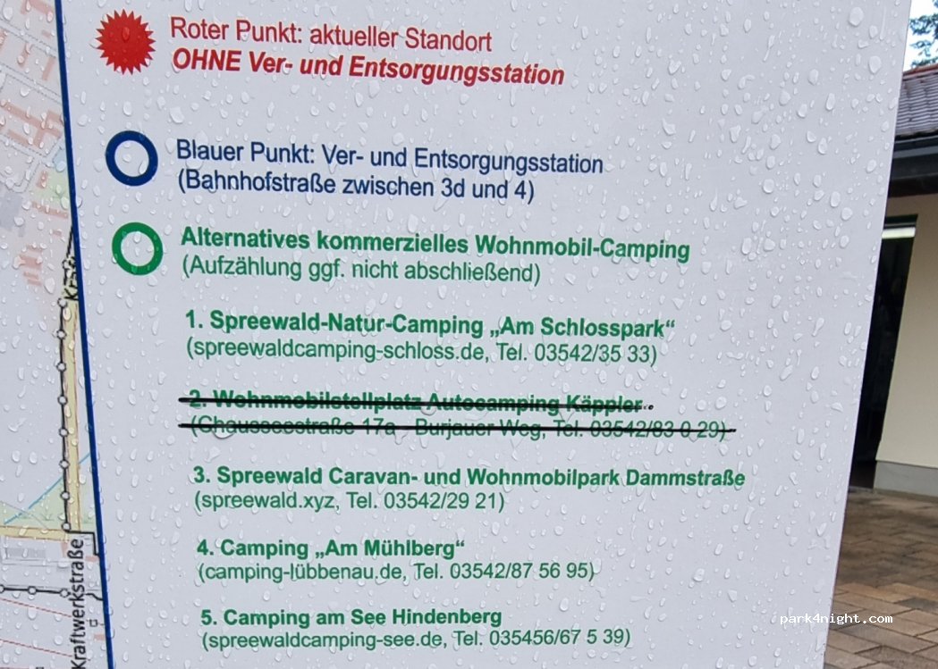 Sehr zentrale Lage ohne jeden Service. Auf der linken Seite ausreichend Naturschatten. Gut für einen Zwischenstopp im Spreewald. Saubere Toiletten im Touristenshop an der Einfahrt zum Parkplatz (1 Euro). Bäcker ca. 500 Meter. Für Sauna-Fans: Spreewaldtherme (ca. 2 km mit dem Fahrrad). 25 EUR/ 24 h sind schon sehr happig. Dafür hat man sehr viel Patz. Außer uns standen dort noch 2 weitere Womos.