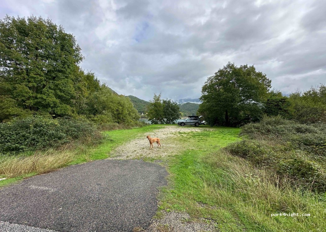 Posto molto panoramico e silenzioso peccato lo sci nautico praticato di giorno. Lago bellissimo posto molto vicino alla bellissima diga panoramica. Punto di sosta pressoché pianeggiante e molto tranquilla di giorno e di notte. Percorrendo un piccolo sentiero si ha accesso al lago dove si può prendere il sole scattare bellissime foto e andare a pesca. Acqua molto limpida. È un'oasi di pace