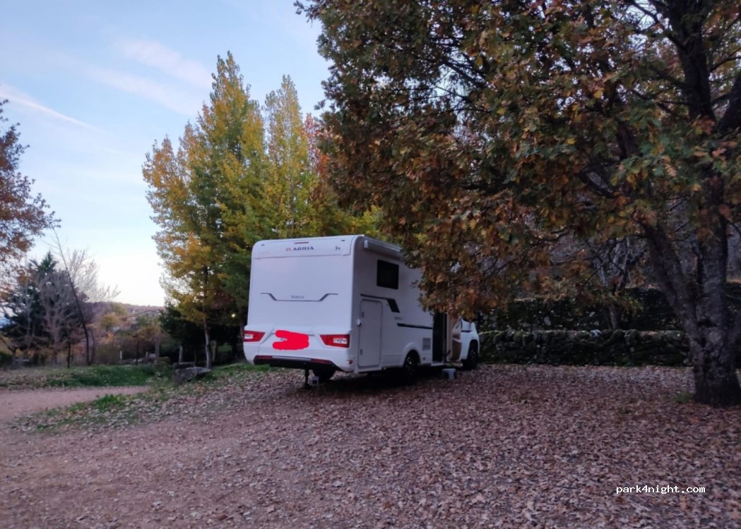 Autocaravana de 7'5 metros. Se accede con cuidado por la pista de cemento, sin cruzar el pueblo. 25 metros por calzada romana. Dos terrazas, la superior entre árboles, algo desnivelada. La inferior es llana. Ruta de Los Huertos y Molinos salen de allí mismo. Ruta de los espejos en esta época es preciosa. Panadería con buen pan. En la plaza una tienda con productos de la zona y un par de bares.