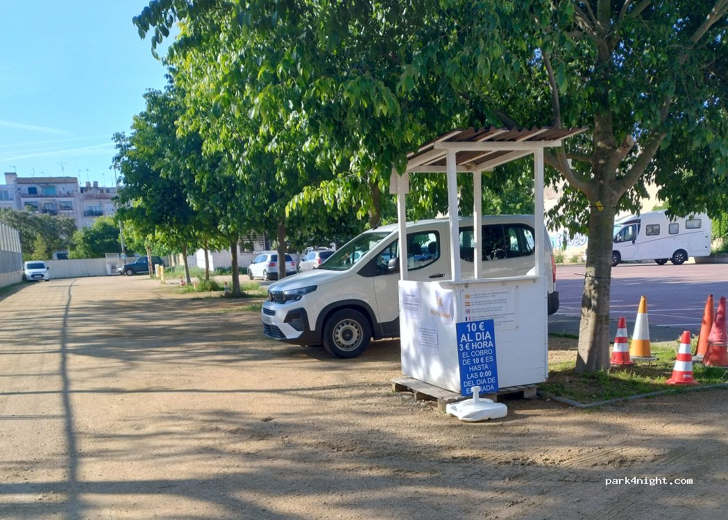 You can only park you car there for the day, no sleeping. The guy at the front told us no sleeping and its 7 euros for the day. Pretty far (15min from the beach). I recommend to park at the bigger parking for 15 euros, they let overnight parking/sleeping.