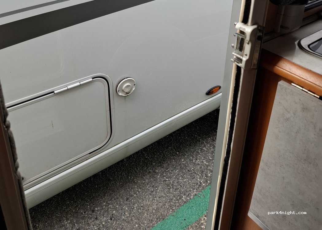 Parcheggio eccellente. Per l’acqua si paga attraverso una colonna, aprendo l’armadietto la pompa era inserita nel tubo per il WC, un vero e proprio schifo. Per l’elettricità è necessario un gettone da 4,20€, si ottiene pagando nella stessa colonna: impossibile utilizzarlo perché la colonnina dell’elettricità non riceve il gettone. In quanto al parcheggio mi sono sentito molto sicuro per la notte.