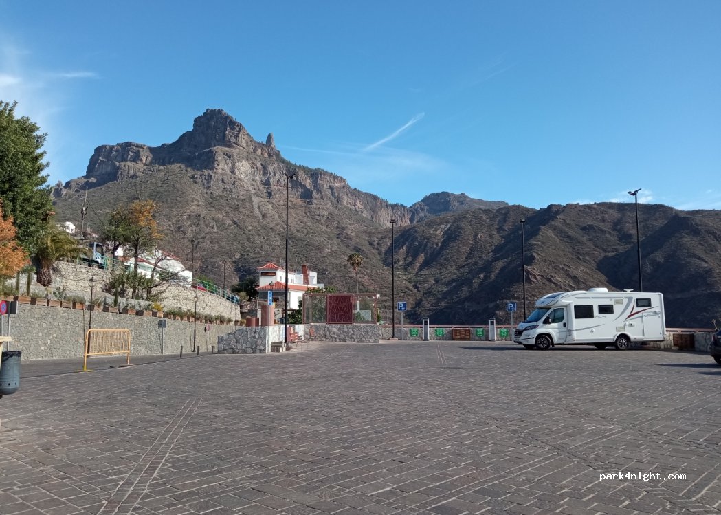 Very nice place with outstanding views to Roque Nublo and Roque Bentayga. Supermarket, cafeterias, park for children, very clean public toilets near. The first entrance on the left takes you to the bottom parking which looks quieter (I stayed at the top parking and it was ok).