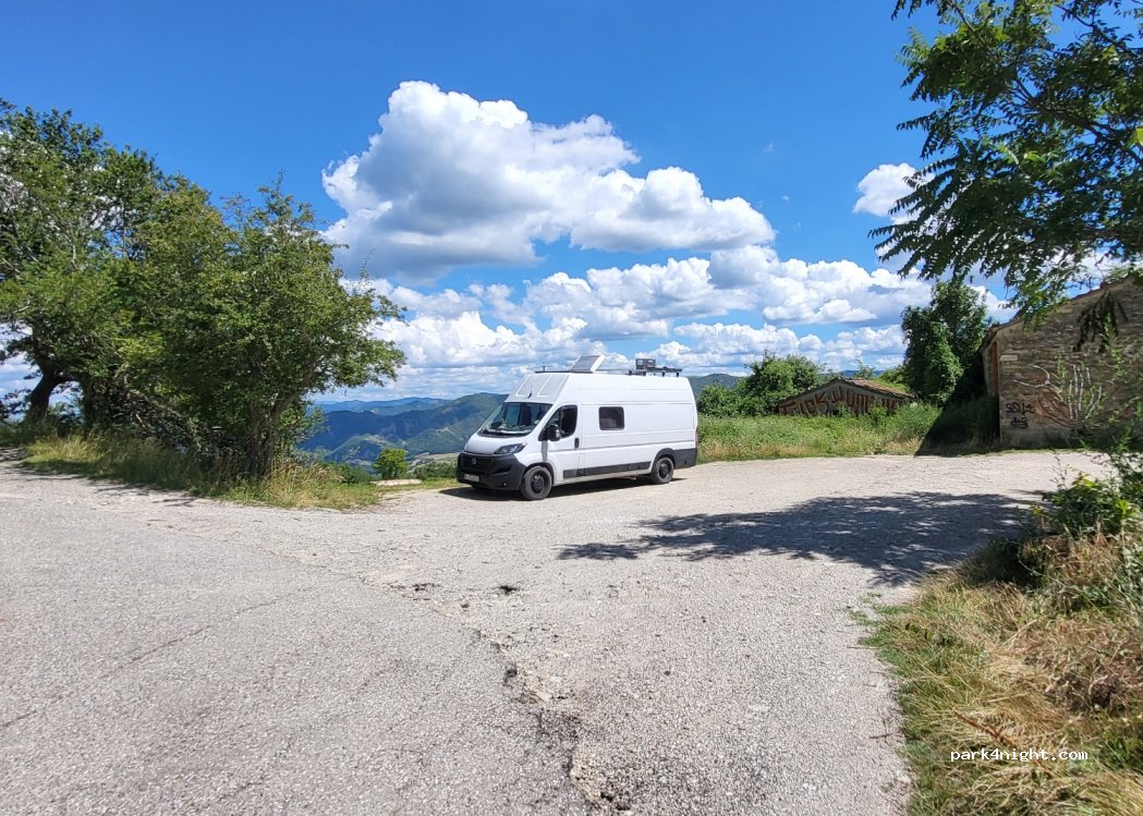 A quiet place with a nice view of nearby hills. We stayed one night here without problems. There is a road nearby, but it is almost unused. We heard 3 or 4 cars pass by during the night, mainly in early morning.
