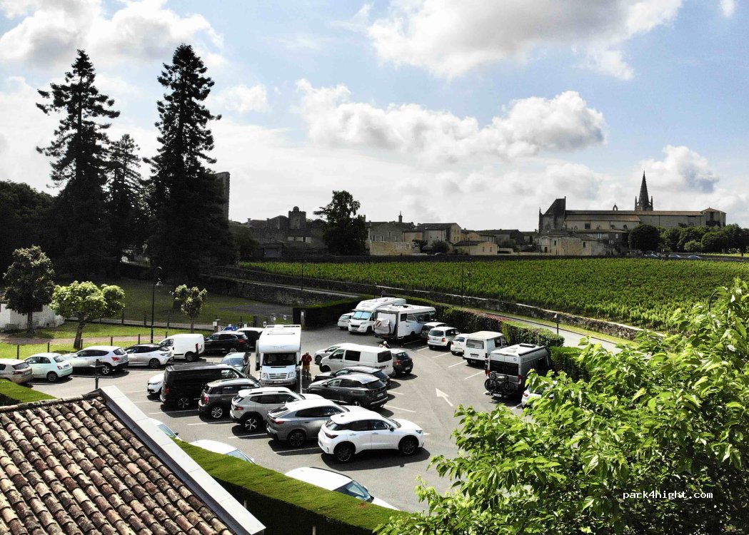 Parking gratuit et nuitée possible autorisée. Sur goudron en dévers prévoir cales. A 5 mn du centre ville à pied. Pas d'ombre aucun service bruyant car route passagère en bordure mais pratique pour passer une journée et une soirée à Saint Emilion. C'est bien que les municipalités prennent de telles autorisations au profit de leurs commerçants.