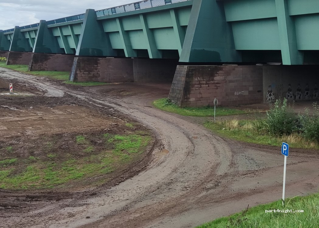 Interessanter Platz, unter einer Brücke gut geeignet bei Regen. Sonst weniger schön und laute Fabrik in der Nähe. Platz ist für 100 Womos, da sollte immer was frei sein.
