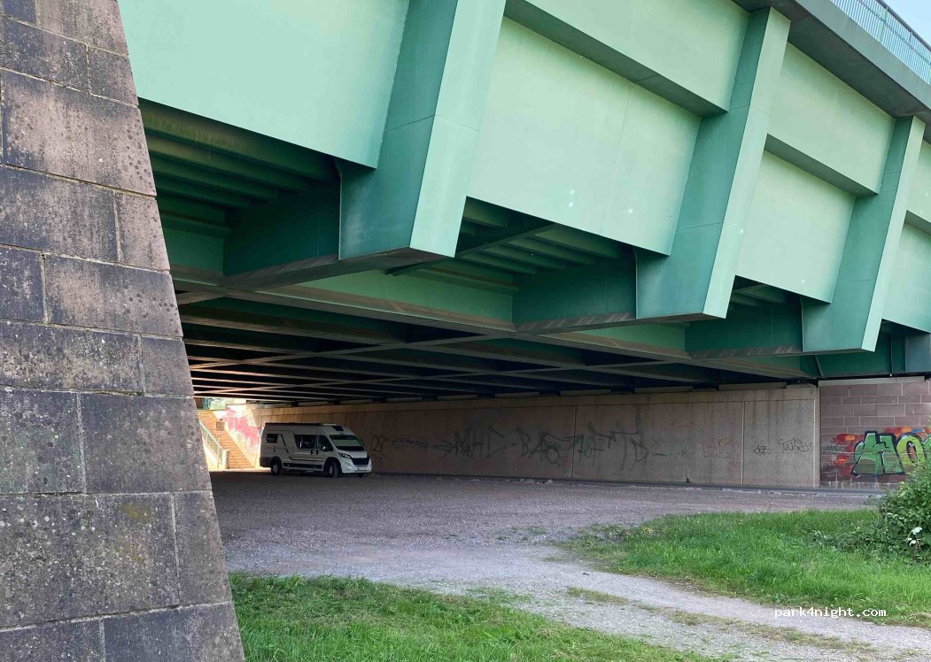 Großartiger Platz unter einer Flussbrücke (der Fluss fließt über dem Brücke). Auch für sehr große Wohnmobile geeignet.
