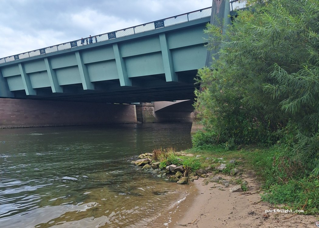 Bis zum Ende der Hermannstr. fahren., der Beschilderung P5 folgen, unbefestigter Weg zum Teil mit Schlaglöchern. Man steht unter einem der Brűckenbögen.