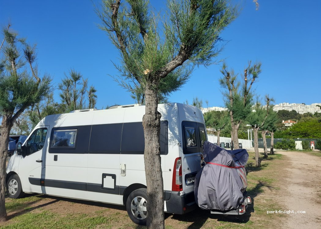il y a 3 aires de Camping-car côte à côte. beaucoup de places . très bon accueil . 20€ et 3€ par jour . la plage est à 50m . transats et parasols bleus réservés à l'aire. escaliers pour visiter la ville ( 20mn à pied ). calme la journée mais un peu bruyant le soir ( musique aux alentours ) jusqu'à minuit ( nous étions samedi et dimanche) .
