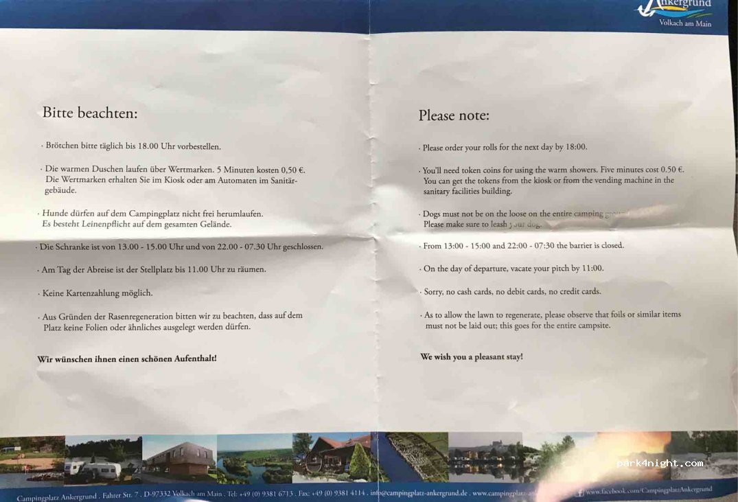 Camping Ankergrund. Situé directement sur la principale, à environ 10 minutes à pied du centre de Volkach. Belles pistes cyclables et de randonnée. Installations paramédicales propres, grands espaces de stationnement.