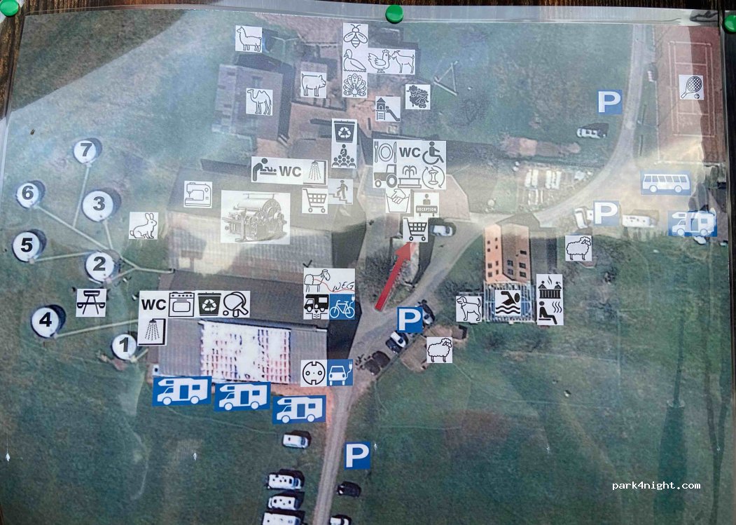 Welcome to the farm, warm and friendly. Here you will find everything about the world of wool. First of all animals: many breeds of sheep, woolly pigs, goats, llamas, camels. But also donkeys, chickens, ducks and even a peacock. Then you can do everything with this fiber: from insulation board to knitting yarn. Self-service bistro for a drink. Breakfast on reservation. Ideal place for families. Possibility of trekking (30 minutes or 1 hour) with camels. Shower and toilet available . Possibility to fill water and empty gray water.