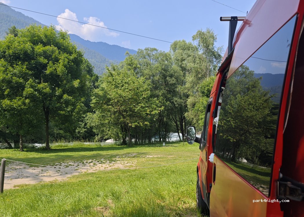 Buona Area sosta,20€ c/corrente + carico/scarico e Bagni pubblici . Di notte molto silenziosa,si sente solo il suono del fiume Noce. Comoda ciclabile per raggiungere Malè e Dimaro. Nota negativa,non ci sono bidoni dell'immondizia.