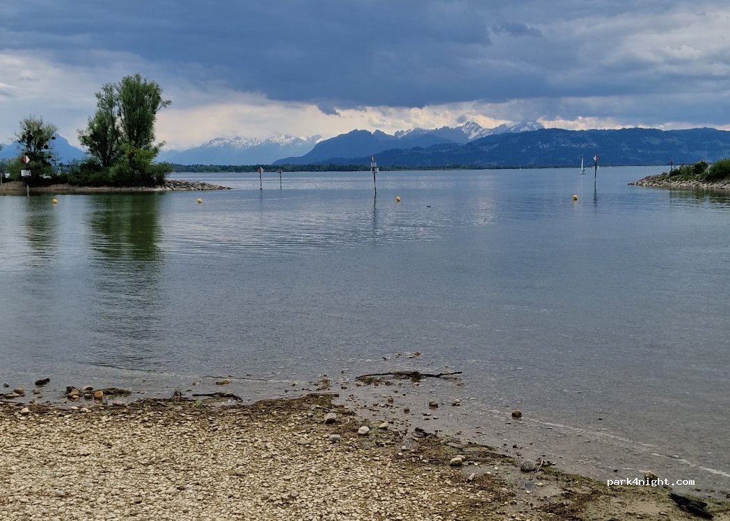 Bona opció per una nit, arriba a les 14h que es quan surt la gent. Pots fer servir tots el serveis del càmping. Places bastant justes, terra de grava anivellat. El càmping te una platja al llac amb una bona posta de sol. Camper i dues persones 21.60€. Amb el preu esta inclòs el bus per anar a la illa de Lindau.