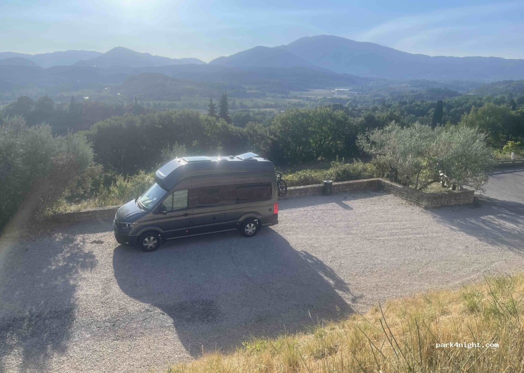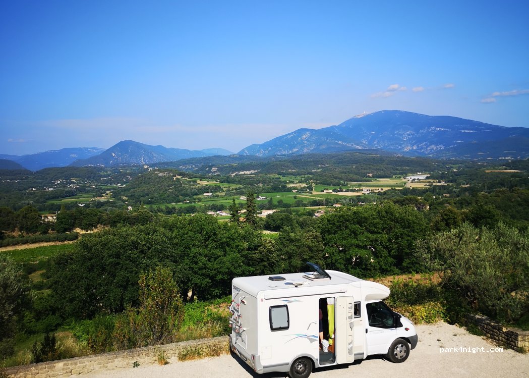 Petit parking sympa et calme, nuit tranquille, vue magnifique sur le Mont Ventoux. Plat et relativement grand pour plusieurs vans ou CC. A proximité immédiate du village pour se balader en plus.