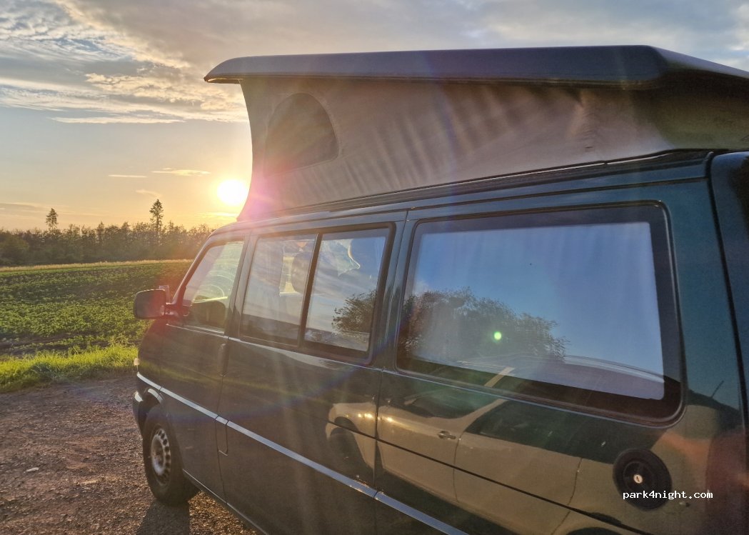 Wir standen hier eine Nacht. Direkt am Wald, neben Feldern. Man sieht von weitem Wohnhäuser, jedoch hat sich niemand an uns gestört. Schöner Sonnenuntergang.