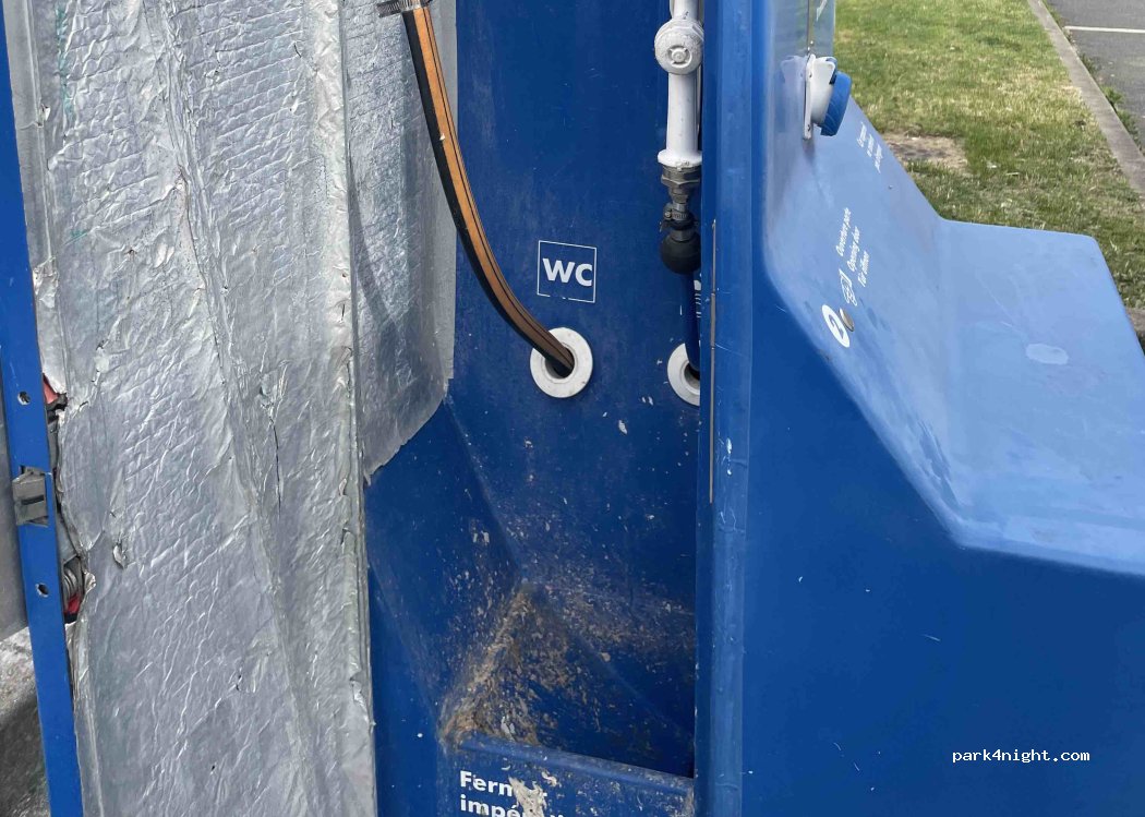 Attention prendre la voie de gauche en entrant sur l'aire ! Gratuit et propre mais en temps de pénurie d'eau dans certaines régions, laisser couler l'eau de 2 tuyaux (WC eau propre) pendant 20 min est un vrai gâchis !! Ce qui vaut 2 étoiles en moins. il suffirait d'ajouter un bouton stop ou d'arrêter le cycle lorsque la porte est verrouillée.