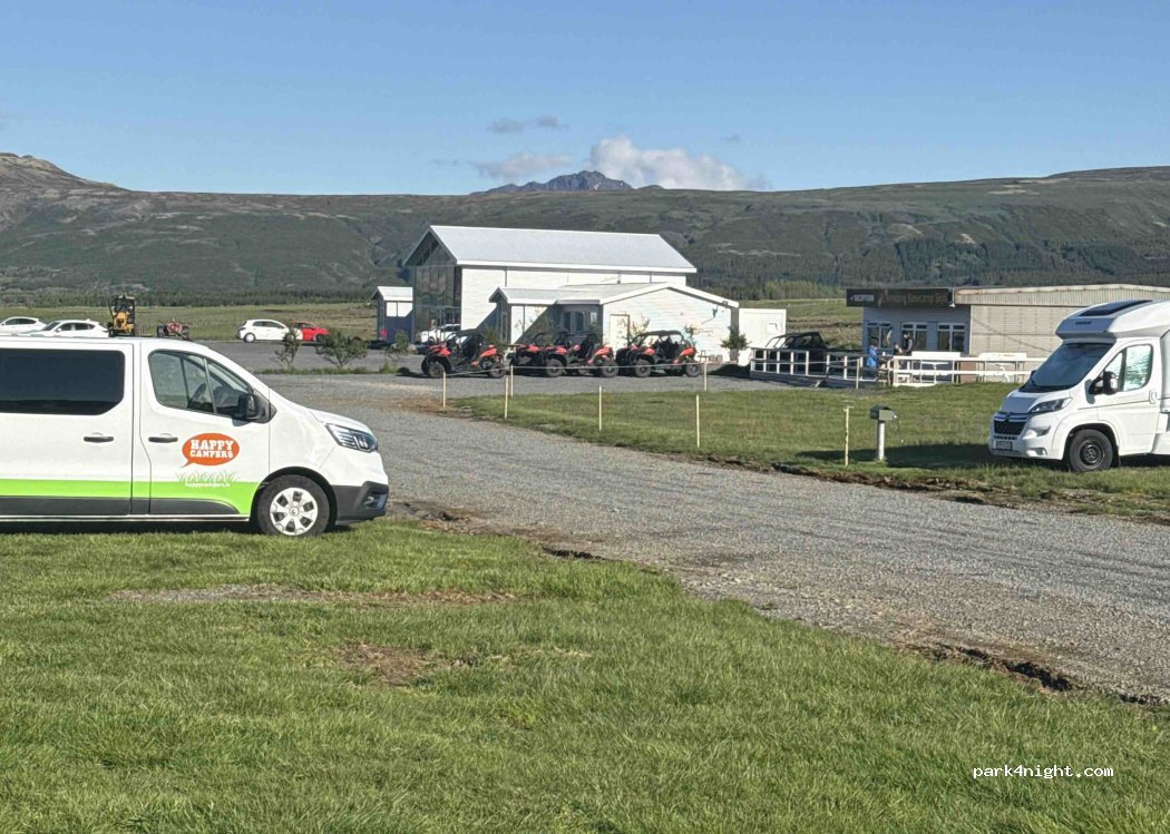Pas le choix que d y aller par respect de l Islande ou le camping sauvage est interdit. Mais c est juste un parking dans une allée gravillonnée (mal). On est tous garés en file indienne. Mais personnel du restau / réception très sympathique.