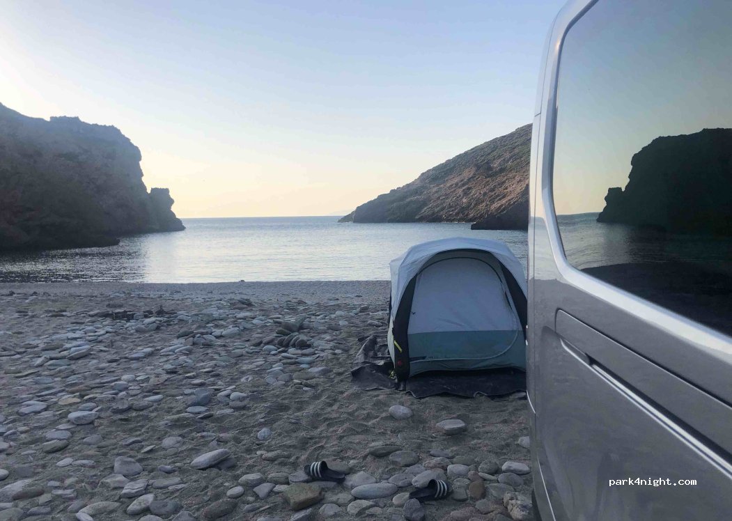 The village that you need to pass trough is quite narrow and just hope not have have a car coming the other way (you are driving down). We left the beach from the other(continuing) road. The beach has no shadow but you can park anywhere at the hectic parking. Super quiet and no problem for camping.