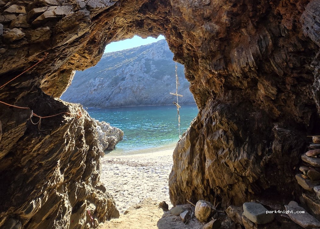 Wunderschöne Bucht windgeschützt da ziemlich eng. Glasklares Wasser. Parkmöglichkeiten an der Taverne auch über Nacht für ein Getränk oder Mahlzeit mit regionalen Produkten der rigenen Schafe der Umgebung. Familienfreundlicher Familienbetrieb. Toiletten & StrandDuschen des Lokals 24/7 nutzbar. Wlan auf Anfrage. Vorsaison stehen am Strand Hauptsaison am Parkplatz. Meeresrauschen und Grillenzirben.