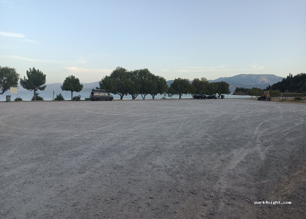 Gut geschotterter Platz. Einfahrt etwas schmal. Höhe und Überhang beachten! Duschen, Wasserhahn Mülleimer und ein Kiesstrand vorhanden. Sportplatz (Basketball/Fußball etc) nebendran. Tavernen und Strandpromenade zu Fuss erreichbar. Keine Fliegen oder Mücken. Nachts sehr ruhig, tagsüber viele Einheimische zum Baden, KEIN Schatten fürs Auto, Klo, Entsorgung für Womo vorhanden. LTE Netz. Sonst schön