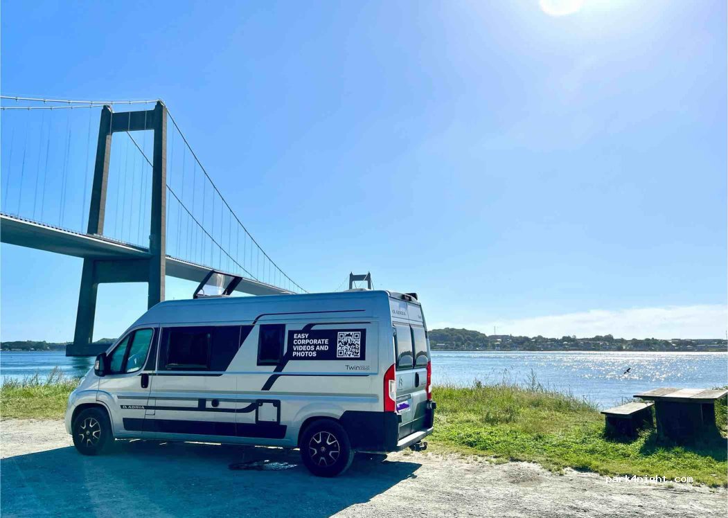 Fin lille parkeringsplads under Lillebæltsbroen. Nogle brokker sig over støjen fra broen, det lagde jeg dog ikke selv mærke til.
